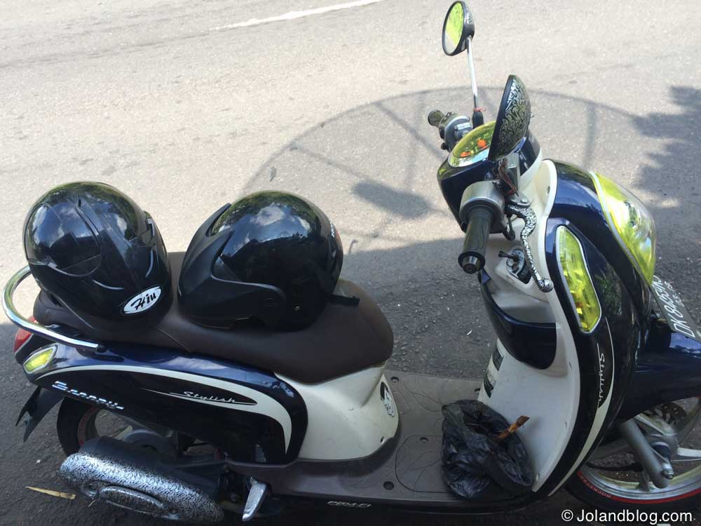 No dia da partida para Amed, deixa a homestay onde estávamos alojados cedo de manhã em busca de uma nova mota, voltando apenas 3 horas depois. “Conseguiste mota?”, pergunto eu. “Sim, consegui. Queres vê-la?”. Sigo atrás dele, com grandes expectativas sobre o “bicho” que nos levaria até Amed em segurança e de forma confortável. Chegamos à rua e eu vejo algumas motas estacionadas em fila. Existiam umas 2 ou 3 que me pareciam indicadas para esta viagem. Mas comecei a perder a esperança quando passámos por elas sem parar. Finalmente o Cyprian pára junto a uma. Não consigo deixar de transparecer uma pontinha de desilusão. A mota escolhida era ainda mais antiga e mais pequena do que a outra que tínhamos até então, e eu não conseguia ver de que forma seria possível viajarmos os dois com 2 mochilas enormes e um didgeridoo (que o acompanhava para todo o lado) durante 2 a 3 horas. “Foi muito caro o aluguer?“, pergunto eu. “Na verdade, comprei-a.”. Jesus. O receio aumentou ainda mais depois do dono da homestay ter dado uma vista de olhos à mota e ter dito logo que estava praticamente sem travões.