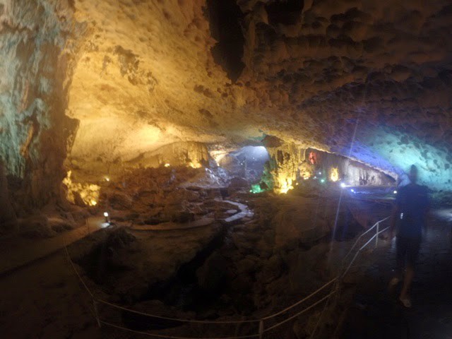 Visitei 2 grutas de caiaque e aventurei-me com a Paola pagando mais 30.000 dongs (cerca de €1,50) para visitarmos (também de caiaque) outra gruta que não estava no roteiro inicial mas que dava acesso a uma baía linda onde não se ouvia mais nada senão o barulho dos nossos remos, as andorinhas dentro da gruta e os macacos nas rochas. Foi um momento mágico. Acabámos o passeio com uma visita a pé a uma outra gruta enorme que de tamanha imponência e beleza quase parecia ser um cenário construído para um filme. Não é de todo surpreendente que Halong Bay tenha sido considerada uma das 7 maravilhas naturais do mundo e seja Património Mundial.