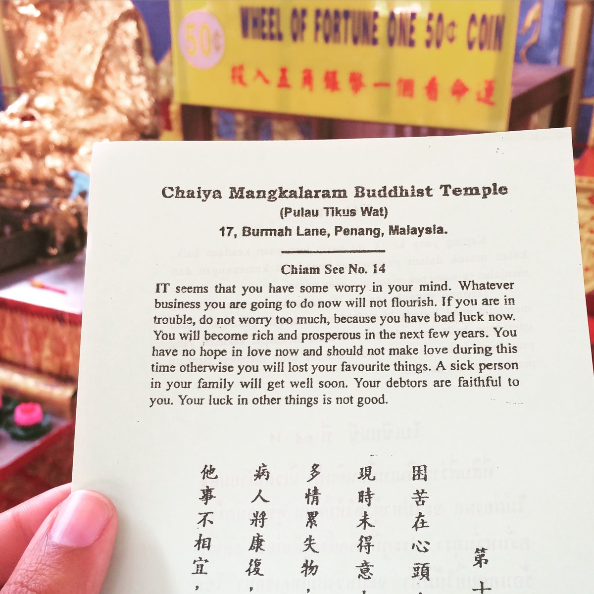 Passo por uma máquina que por 0,50 MYR lê a sorte. Não resisto, mas pelo resultado mais valia ter seguido em frente…! Aparentemente, mais vale ficar bem quietinha agora porque a sorte não abunda por estes lados. Nada de negócios, amor… E termina com um fantástico “a tua sorte noutras coisas também não é boa“. Obrigadinha sim??
