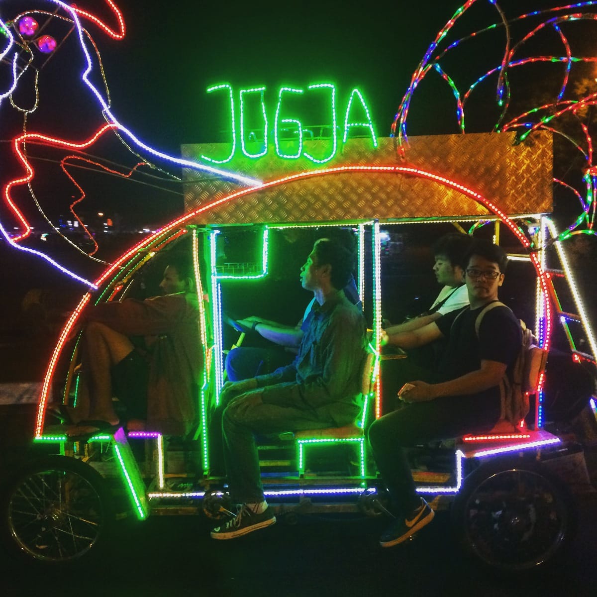 - Em Yogyakarta existe uma loucura generalizada por carros totalmente decorados com neon. Junto à Praça das 2 árvores Banyan, à noite, encontras desfiles de carros destes, cada um mais arrojado que o outro. São imperdíveis!