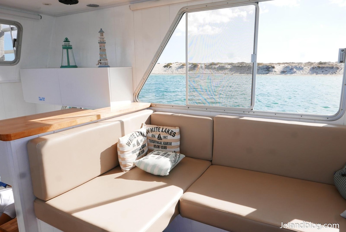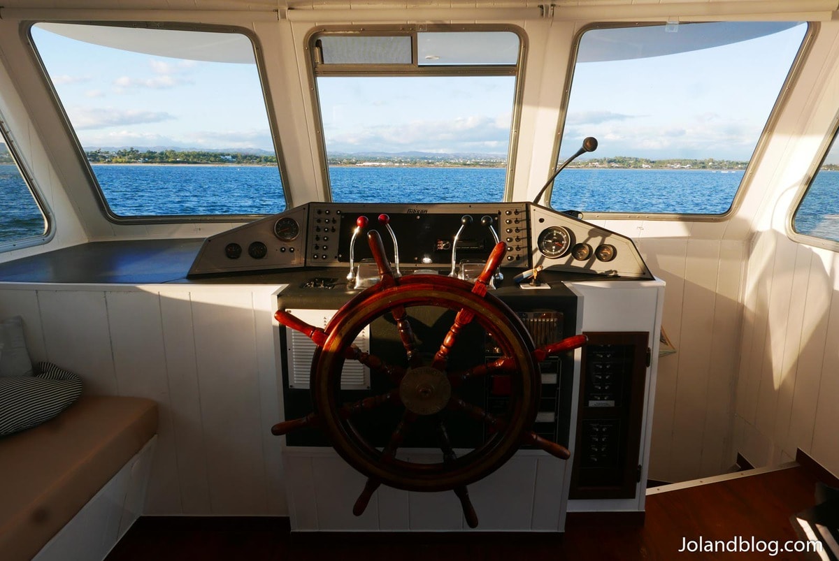 No interior encontrei uma decoração elegante, em tons de branco e azul, com pequenos apontamentos náuticos por todo o lado; um quarto principal com umas janelas enormes a toda a volta que me pôs de imediato a imaginar-me a assistir em primeira fila ao nascer do sol sobre a Ria; uma sala confortável e funcional onde o leme original do barco (hoje apenas peça decorativa, já que o barco não se movimenta na Ria) ocupava um local de destaque, uma cozinha extremamente bem equipada com tudo o que seria necessário para uma estadia confortável e prática e mais 2 quartos onde caberiam na perfeição pelo menos mais 4 pessoas (já para não falar do facto de o sofá na sala se transformar em cama também). No exterior, uma área decorada com sofás e uma mesa de apoio, uma pequena piscina cheia de água do mar, e no topo um espaço amplo forrado a colchões para momentos de descontração total sob o sol algarvio.